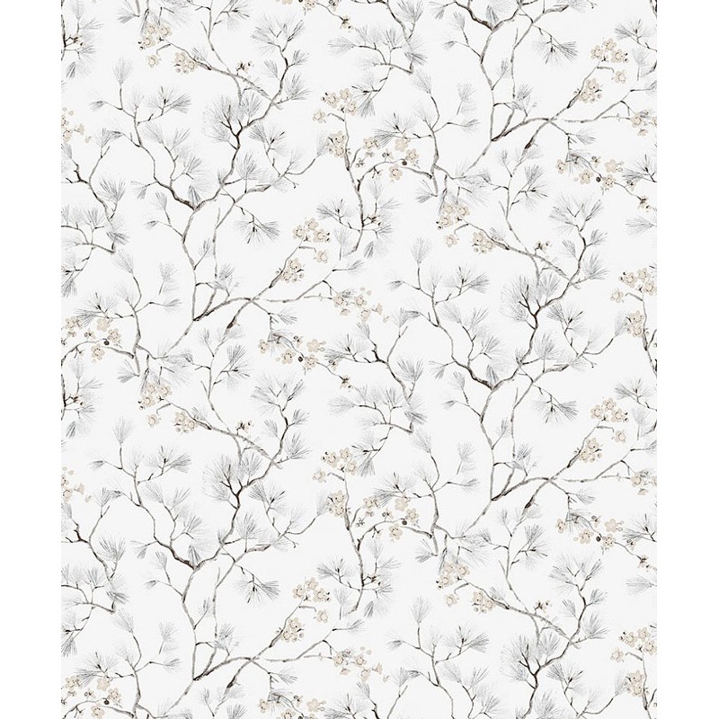 Papier peint avec des fleurs de cerisier de style oriental sur fond blanc et argenté. Papier peint intissé lavable. Dimensions :53 cm x 10 metros
