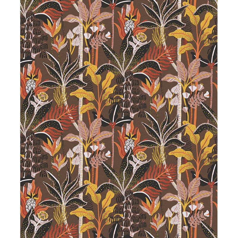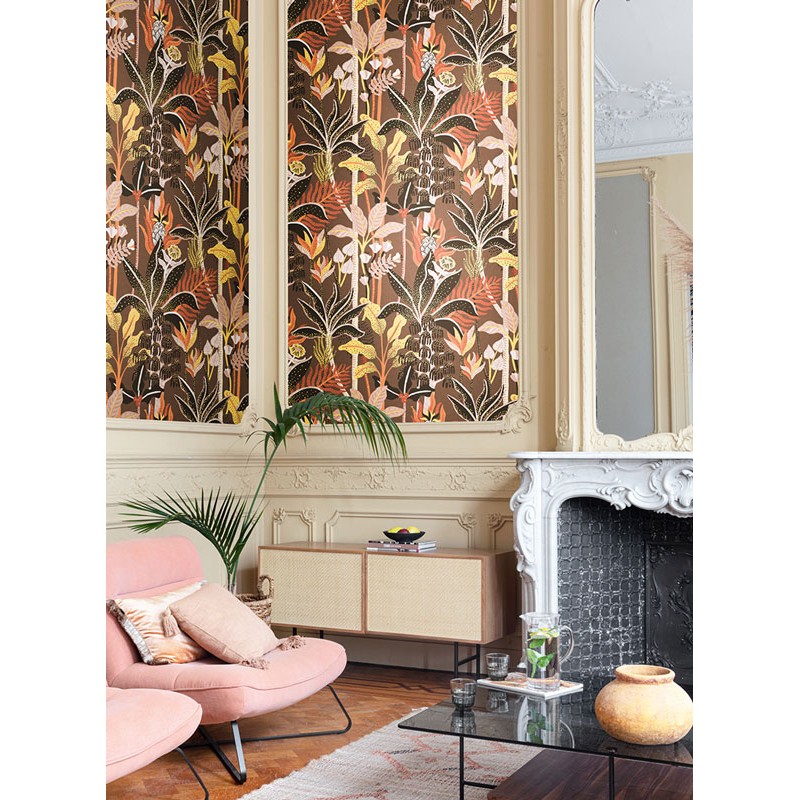 Papel Pintado palmeras tropicales exuberantes sobre fondo marrón de Khroma, colección Havana. Calidad tejido no-tejido lavable, medidas: 53 cm x 10 m.