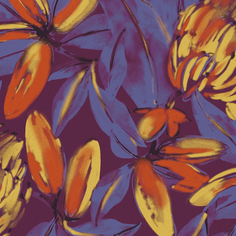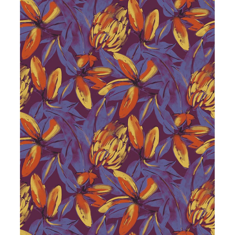 Papel Pintado frutas tropicales morado y dorado metalizado de Khroma, colección Havana. Calidad tejido no-tejido lavable, medidas: 53 cm x 10 m.