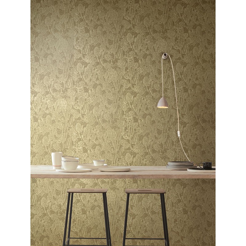 Papel Pintado cactus verdes con efecto metalizado de Khroma, colección Havana. Calidad tejido no-tejido lavable, medidas: 53 cm x 10 m.