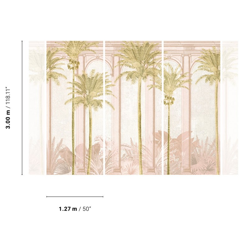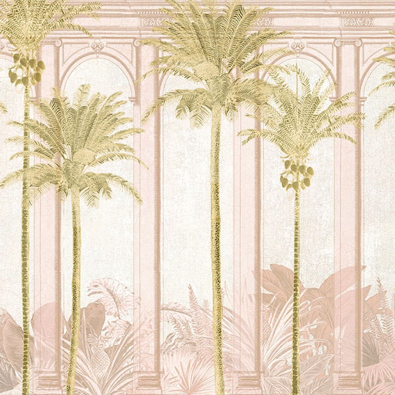 Panel decorativo tipo "fotomural" impreso digitalmente con efecto craquelado con arcos imponentes, palmeras y un vegetación tropical. La combinación perfecta de plantas y arquitectura inspirado en la capital cubana de La Habana.