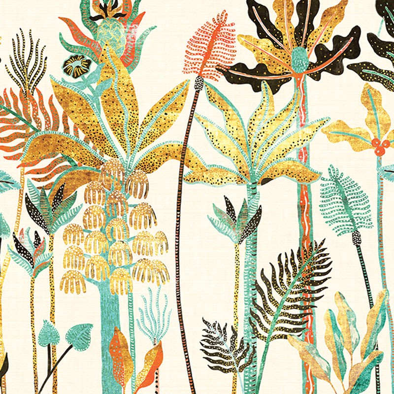 Mural compuesto de 3 paneles decorativos impreso digitalmente inspirado en las típicas palmeras de La Habana con una variedad de hojas tropicales. Su variedad de plantas, puntos y rayas produce un resultado decididamente divertido. Este papel pintado o fotomural impreso cuenta con un fondo con efecto de textil beige que desigual.