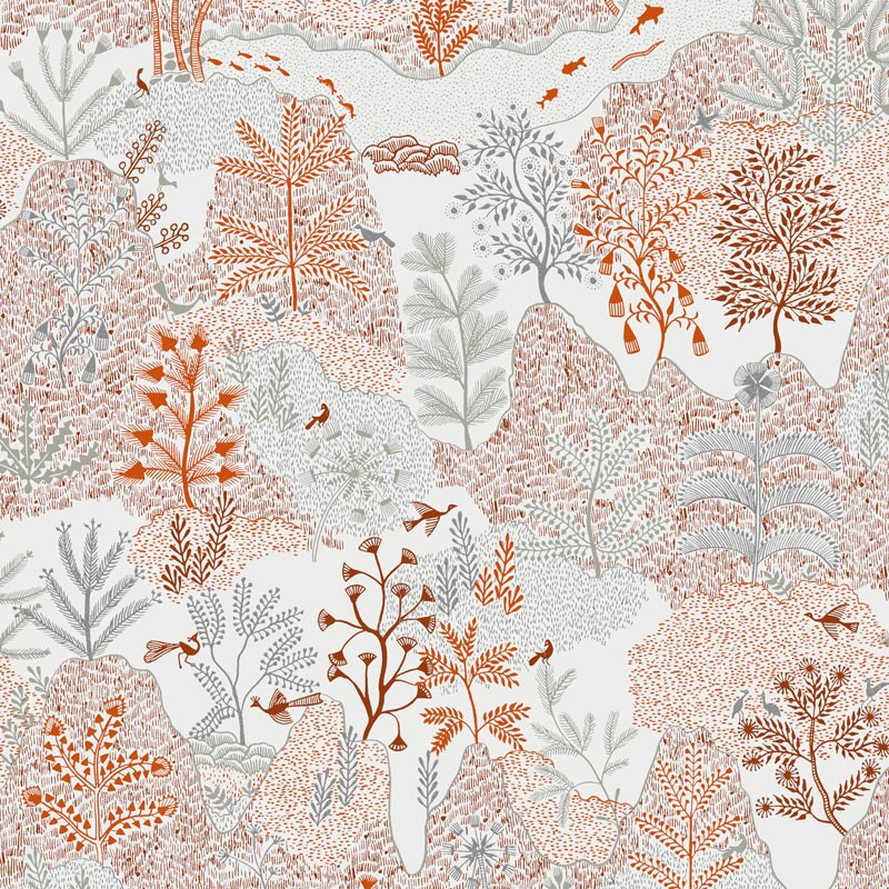 Papel Pintado paisaje Marruecos tonos rojos con fondo gris de Khroma, colección Bahia. Calidad tejido no-tejido lavable, medidas: 53 cm x 10 m.