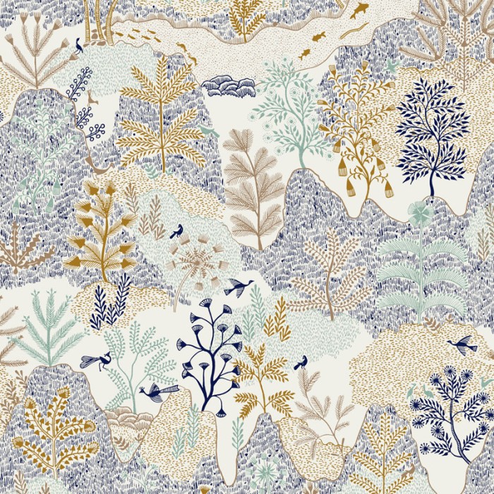 Papel Pintado paisajístico estilo arabesco azul y dorado de Khroma, colección Bahia. Calidad tejido no-tejido lavable, medidas: 53 cm x 10 m.