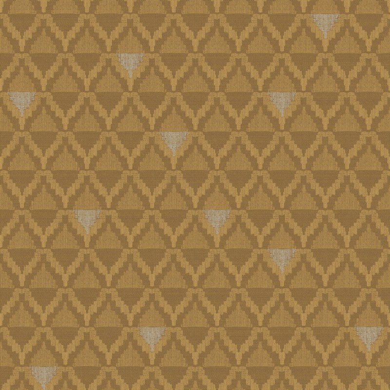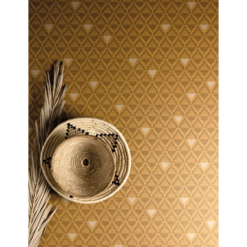 Papel Pintado étnico amarillo ocre y marrón de Khroma, colección Bahia. Calidad tejido no-tejido lavable, medidas: 53 cm x 10 m.