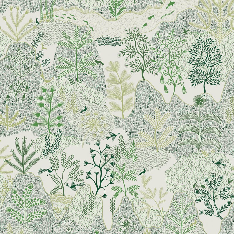 Papel pintado dibujo de un paisaje marroquí verde. Papel de pared calidad tejido no tejido lavable. Medidas: 53 cm x 10 metros