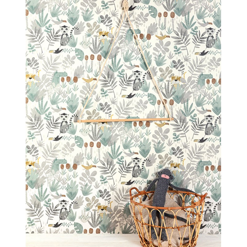 Papel Pintado selva infantil animales salvajes verde y gris de Khroma, colección Be Happy. Calidad tejido no-tejido lavable, medidas: 53 cm x 10 m.