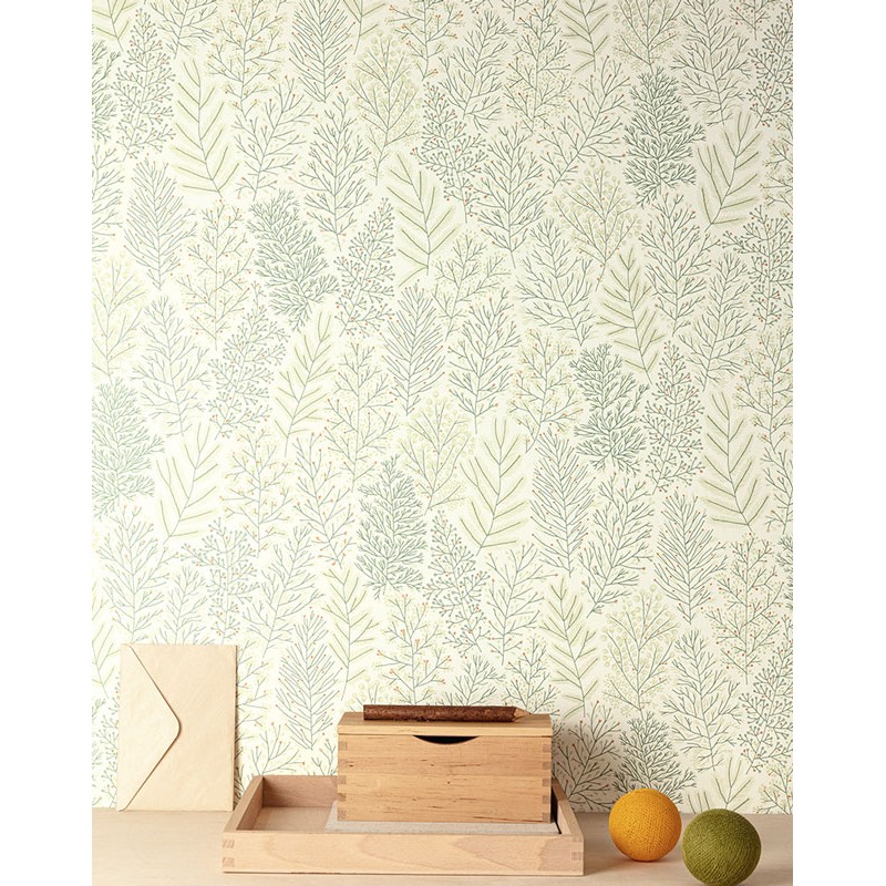 Papel Pintado botánico infantil con ramilletes verdes