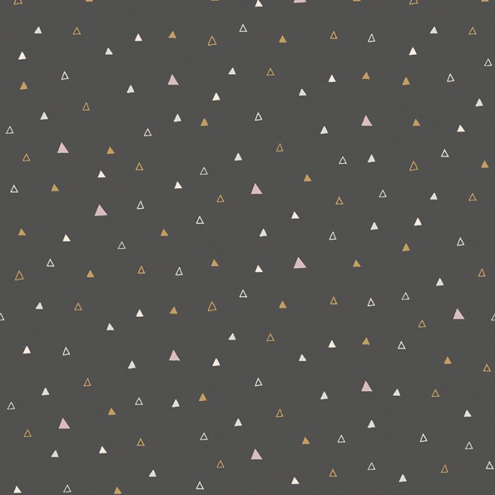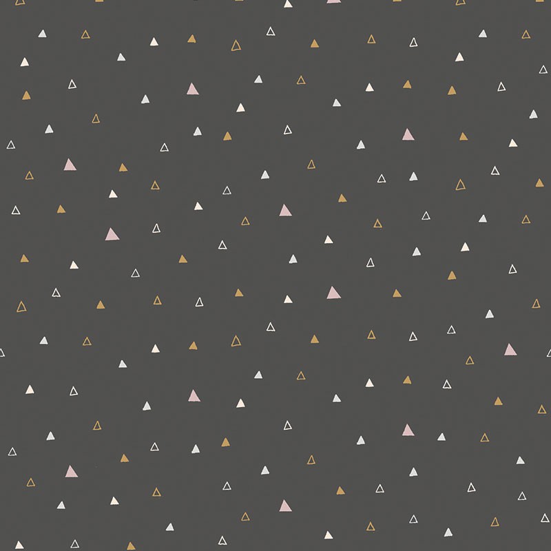 Papel Pintado infantil negro con triángulos rosa y ocre de Khroma, colección Be Happy. Calidad tejido no-tejido lavable, medidas: 53 cm x 10 m.