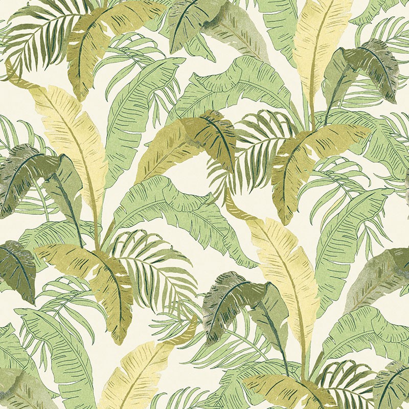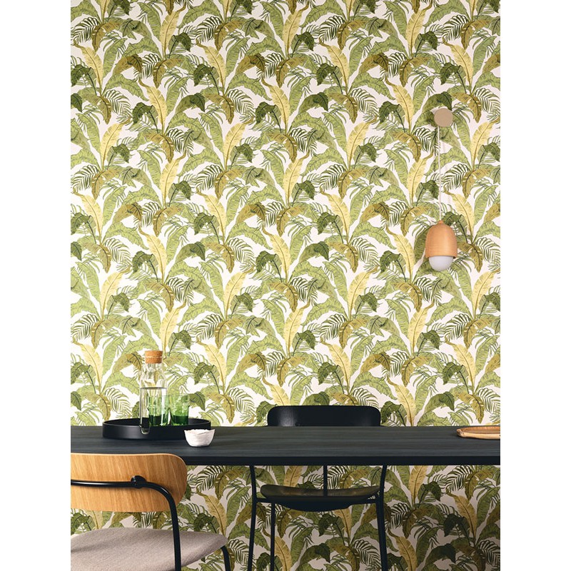 Papel Pintado hojas de banano tropical verdes fondo blanco de Khroma, colección Lotus. Calidad tejido no-tejido lavable, medidas: 53 cm x 10 m.