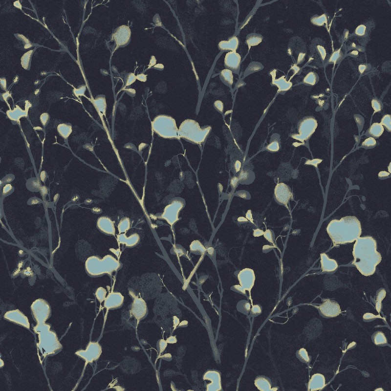 Papel Pintado floral acuarela azul y dorado sobre negro de Khroma, colección Lotus. Calidad tejido no-tejido lavable, medidas: 53 cm x 10 m.