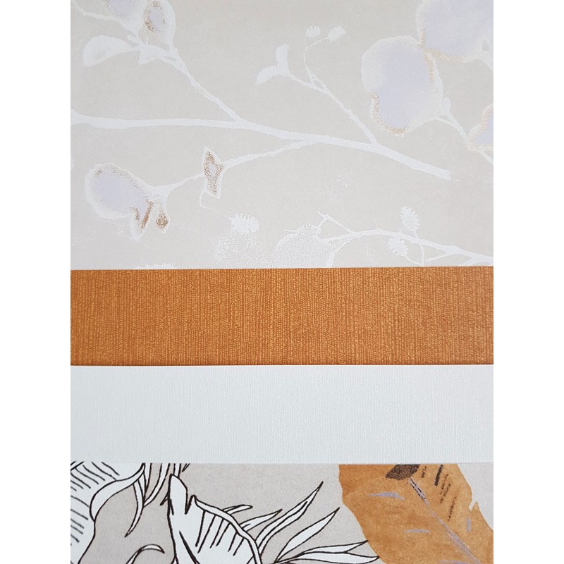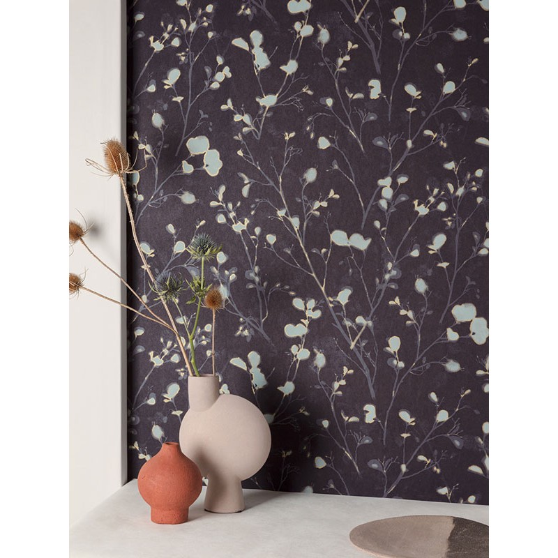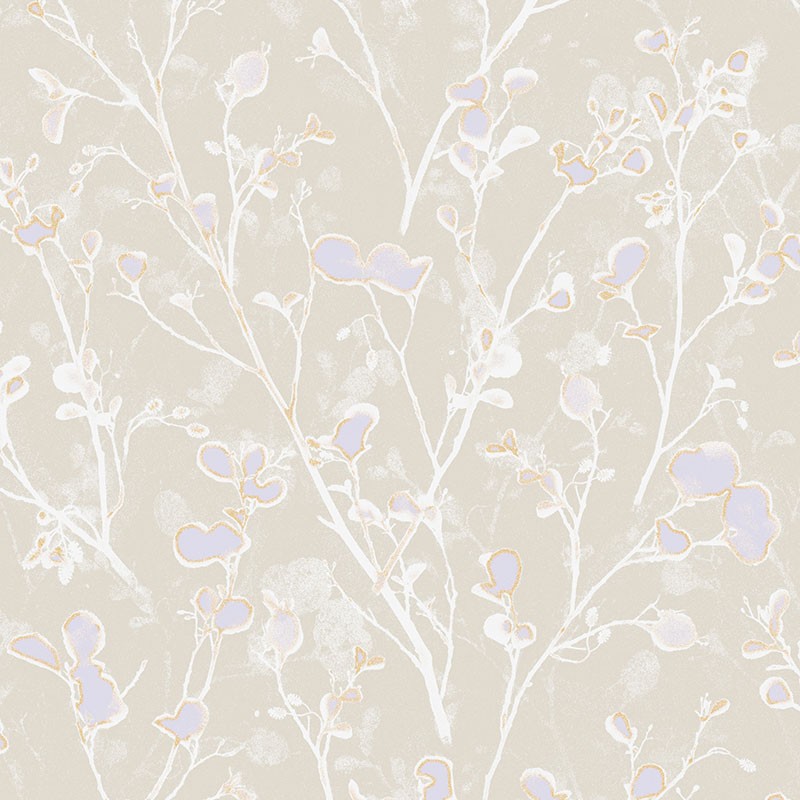 Papel Pintado flores de aliso acuarela azul y lila fondo beige de Khroma, colección Lotus. Calidad tejido no-tejido lavable, medidas: 53 cm x 10 m.