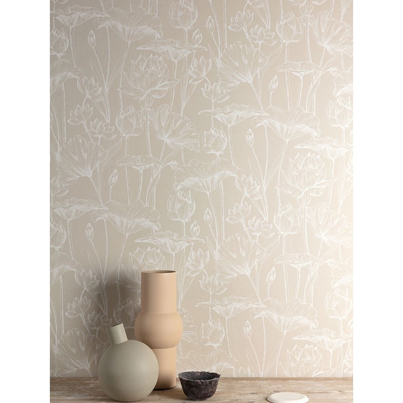 Papeldecor|Papel pintado flores blancas provenzales con fondo color arena|Papel Pintado