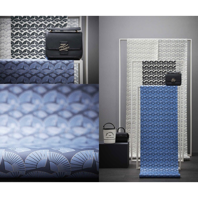Diseño pensado para ambientes acogedores y contemporáneos.. Papel Pintado abanicos Karl Lagerfeld azul y plateado As Creation Karl Lagerfeld 378474.