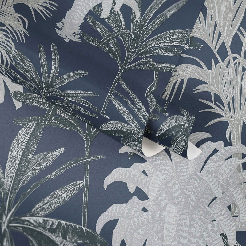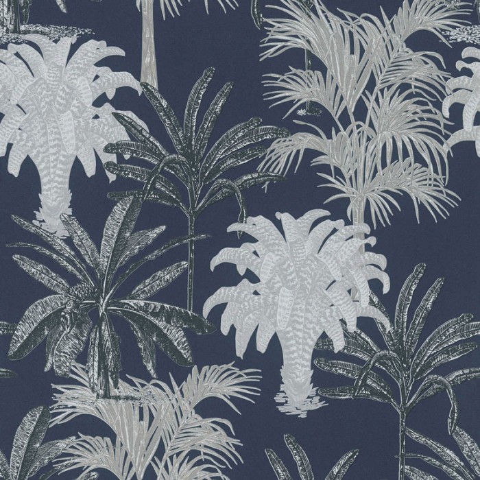 Papel Pintado palmeral azul gris tropical. Perfecto si buscas estilo natural y paredes frescas. Papeldecor 222-2658