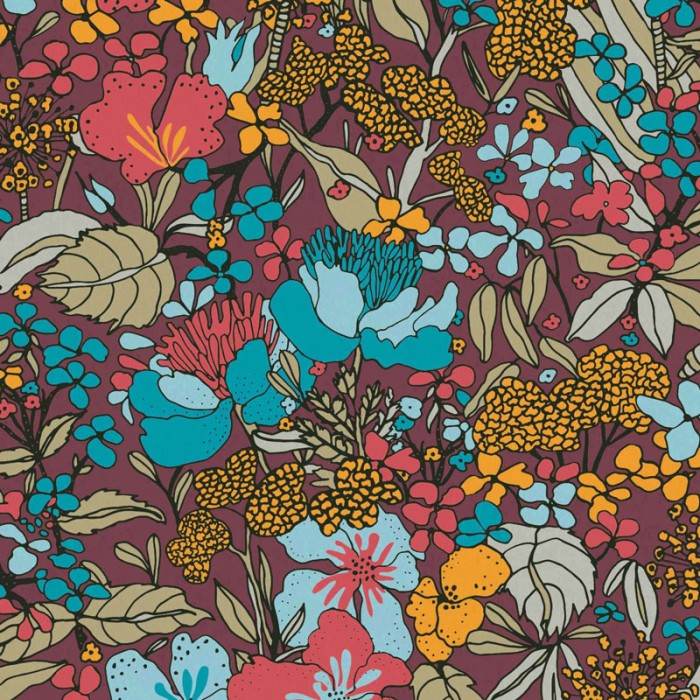 Papel pintado floral morado con flores diseño retro, vibrante y evocador con aire artístico. Architects Paper Floral Impresion, papel de pared calidad tejido no tejido lavable. Medidas: 53 cm x 10 metros