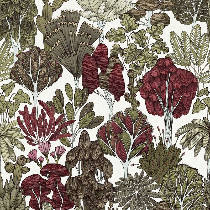Minimalist wallpaper with palm trees and trees in green and white brings natural calm and refreshing simplicity. Architects Paper Floral Impresion, non-woven washable wallpaper. Size: 53 cm x 10 m.