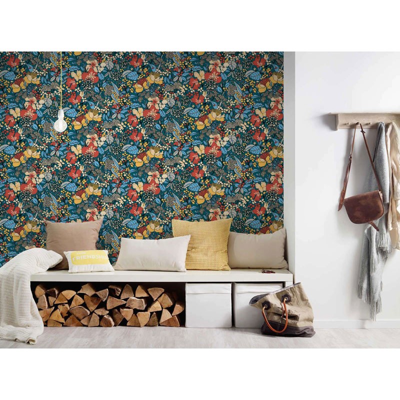 Papeldecor|Papel pintado floral diseño retro azul petróleo multicolor|Papel Pintado