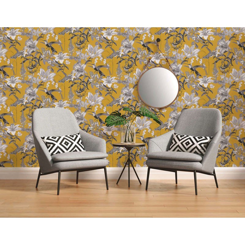Papel pintado floral estilo romántico amarillo mostaza. Vendido por rollo, medidas: 53 cm x 10 metros