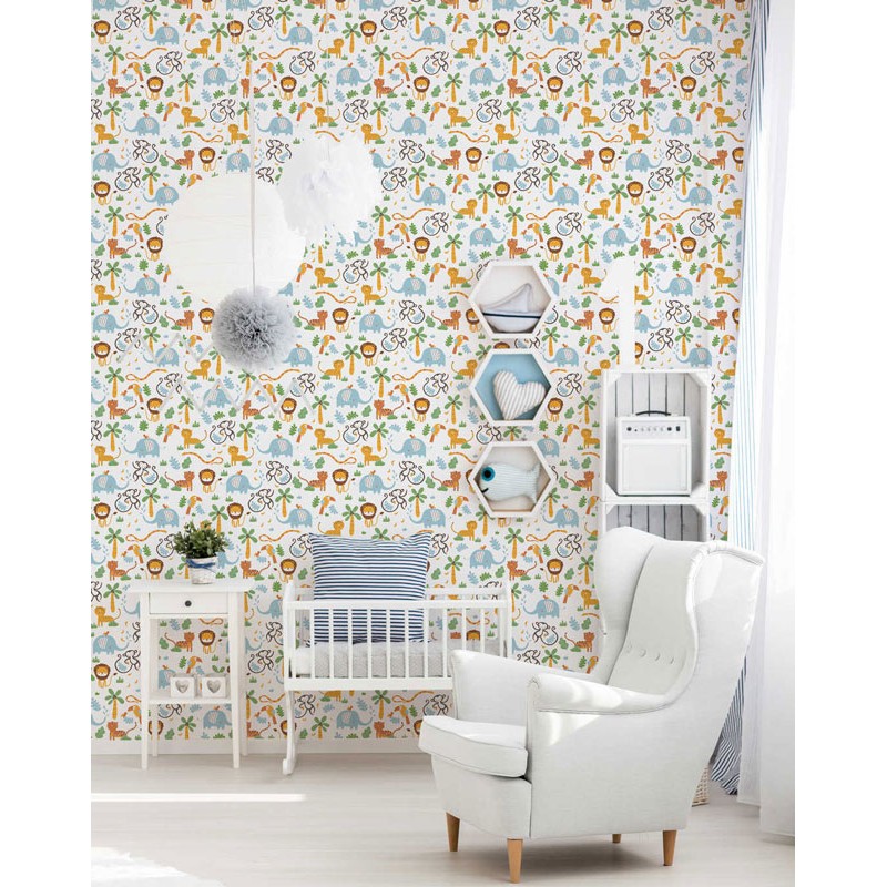Papel pintado infantil animales selva. Perfecto si buscas estilo selvático en cuartos infantiles. Papeldecor 222-3079