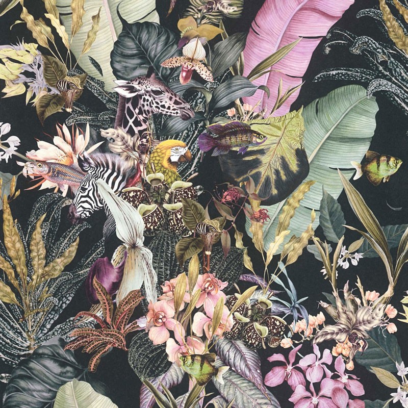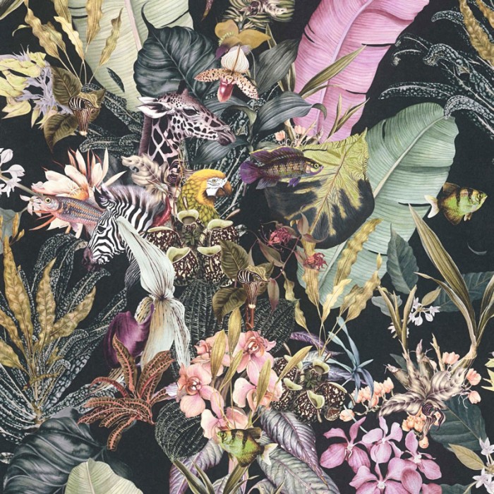 Una propuesta decorativa para espacios con personalidad. Papel Pintado flora y fauna tropical con el fondo negro As Creation Dream Flowery 381761.