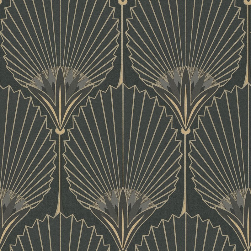 Papel pintado palmeras estilo Gastby gris y dorado. Vendido por rollo, medidas: 53 cm x 10 metros
