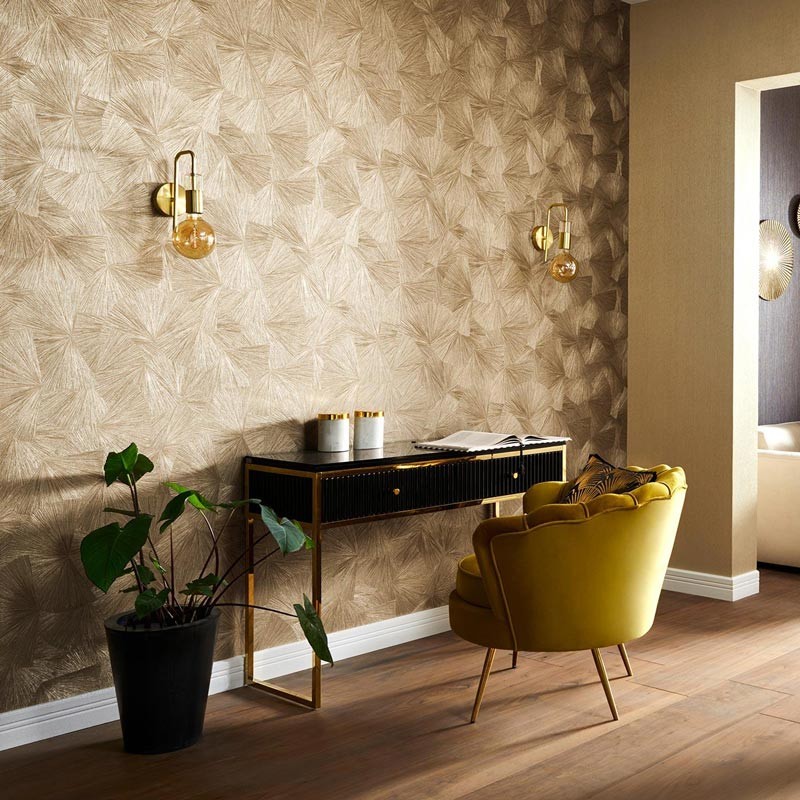 Papel pintado contemporáneo abanicos japoneses dorados marca Erismann, colección Fashion For Walls. Calidad tejido no-tejido lavable, medidas: 53 cm x 10 m.
