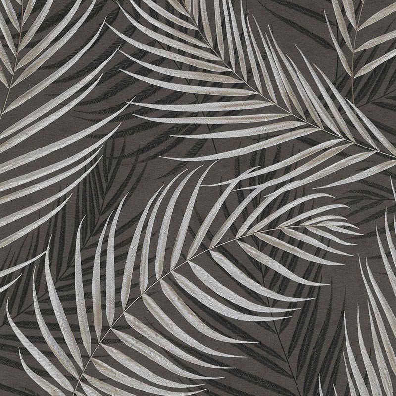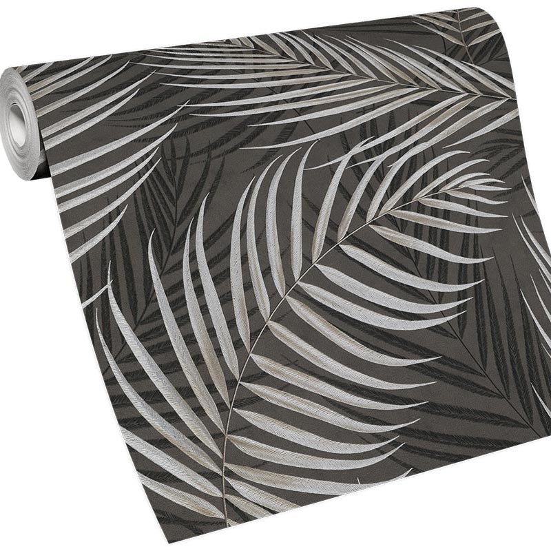 Papel pintado moderno hojas de palma negro y gris plata marca Erismann, colección Fashion For Walls. Calidad tejido no-tejido lavable, medidas: 53 cm x 10 m.