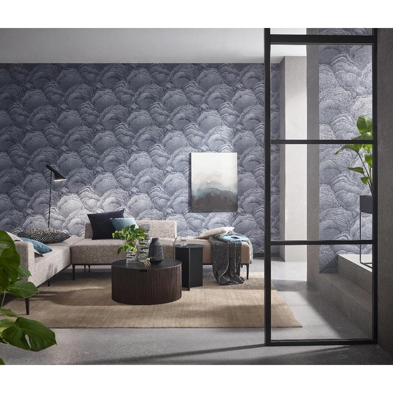 Papel pintado floral con ramas de helechos verde almendra, aportando dinamismo visual a paredes de salones, estudios o recibidores.
