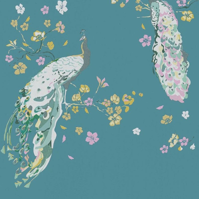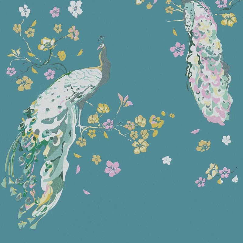 Estilo decorativo que se adapta a distintos espacios del hogar.. Papel Pintado pavos reales y flores efecto brillo azul As Creation House Of Turnowsky 389063.