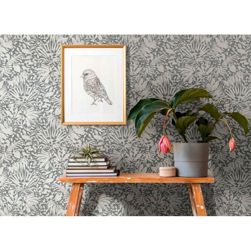 Estilo decorativo que se adapta a distintos espacios del hogar.. Papel Pintado floral hojas gris plata metalizado As Creation Bos 388312.