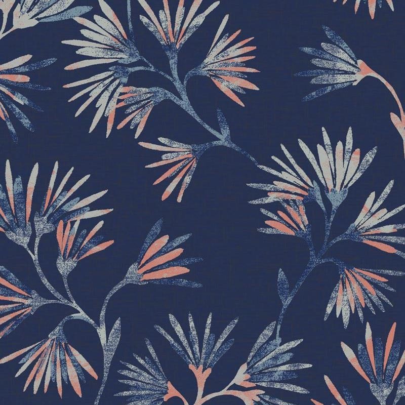 Papel pintado flores japonesas azul efecto textil de Eijffinger, colección Enso. Medidas: 52 cm x 10 m. Papel de pared tejido no tejido y lavable.