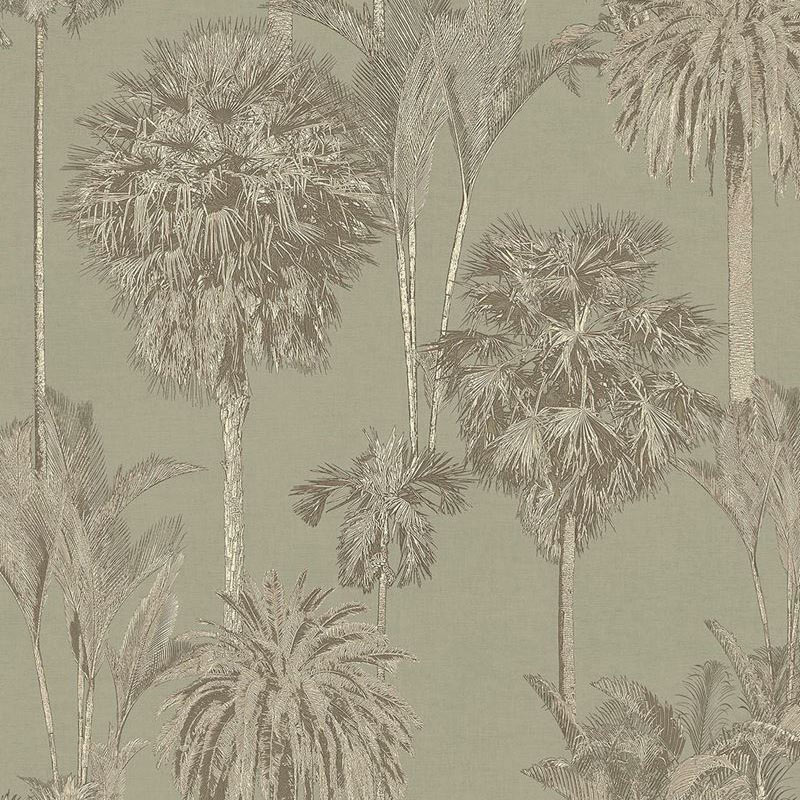 Papel pintado oasis palmeras verdes de Eijffinger, colección Oasis. Medidas: 69 cm x 10 m. Papel de pared tejido no tejido y lavable.