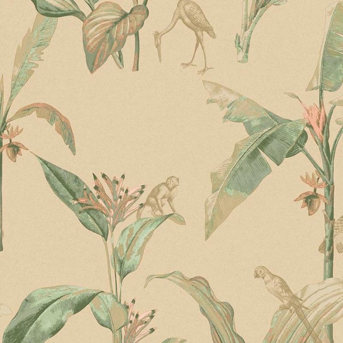 Papel pintado hojas platanero animales exóticos pastel de Eijffinger, colección Oasis. Medidas: 52 cm x 10 m. Papel de pared tejido no tejido y lavable.