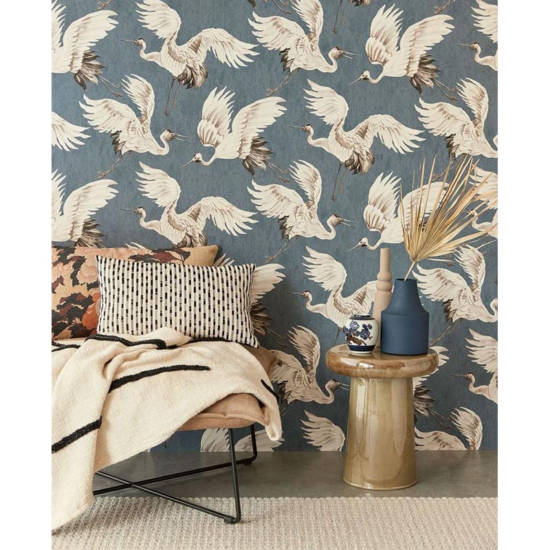 Papel pintado grullas voladoras verde de Eijffinger, colección Oasis. Medidas: 52 cm x 10 m. Papel de pared tejido no tejido y lavable.