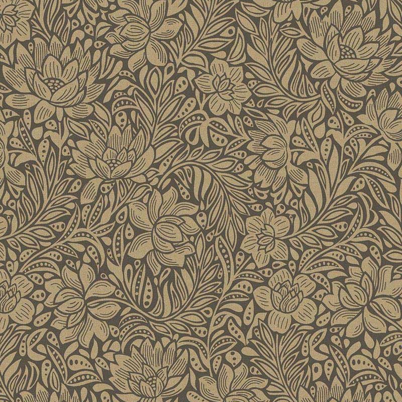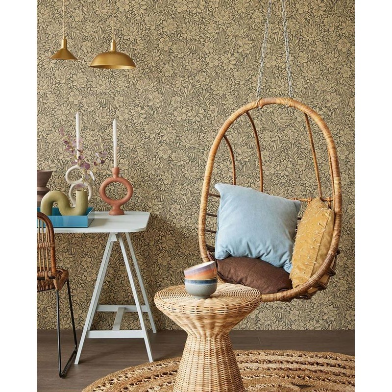 Papel pintado flores vintage textil beige dorado de Eijffinger, colección Posy. Medidas: 52 cm x 10 m. Papel de pared tejido no tejido y lavable.