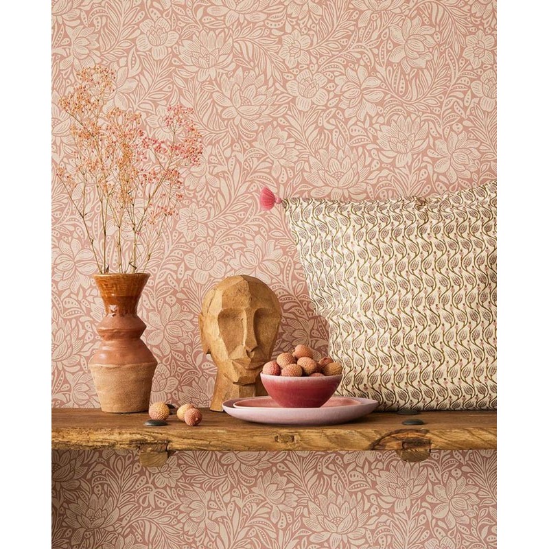 Papel pintado floral rústico beige arena de Eijffinger, colección Posy. Medidas: 52 cm x 10 m. Papel de pared tejido no tejido y lavable.