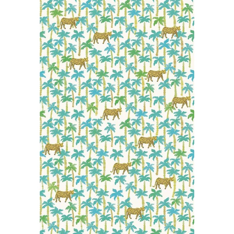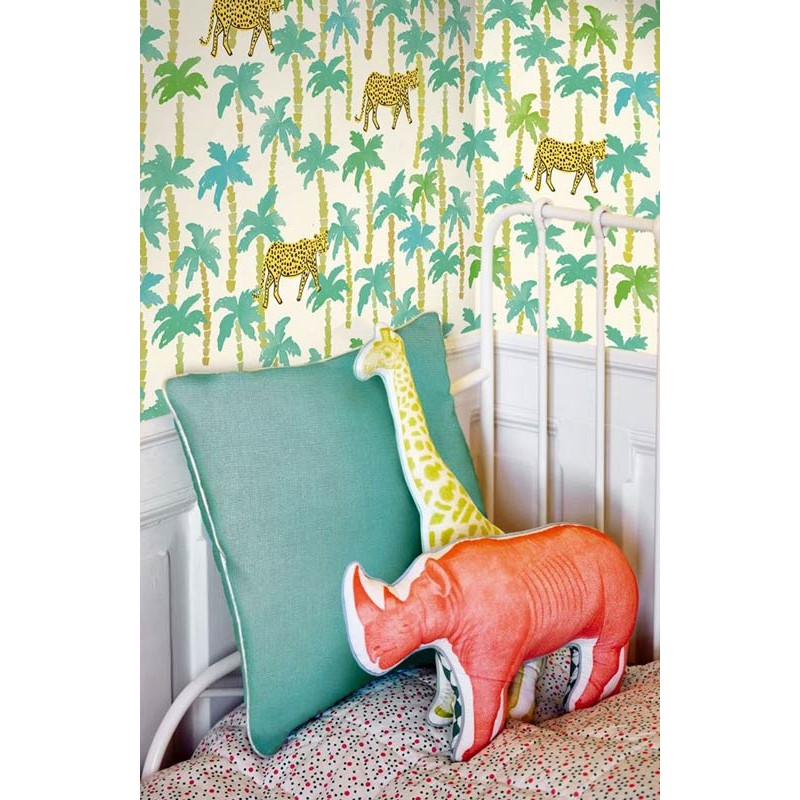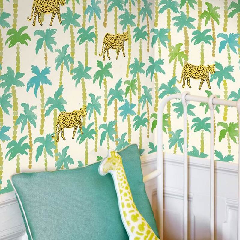 Mural de pared mural infantil con palmeras y leopardos de Eijffinger, colección Rice 2. Medidas: 212 x 280 cm