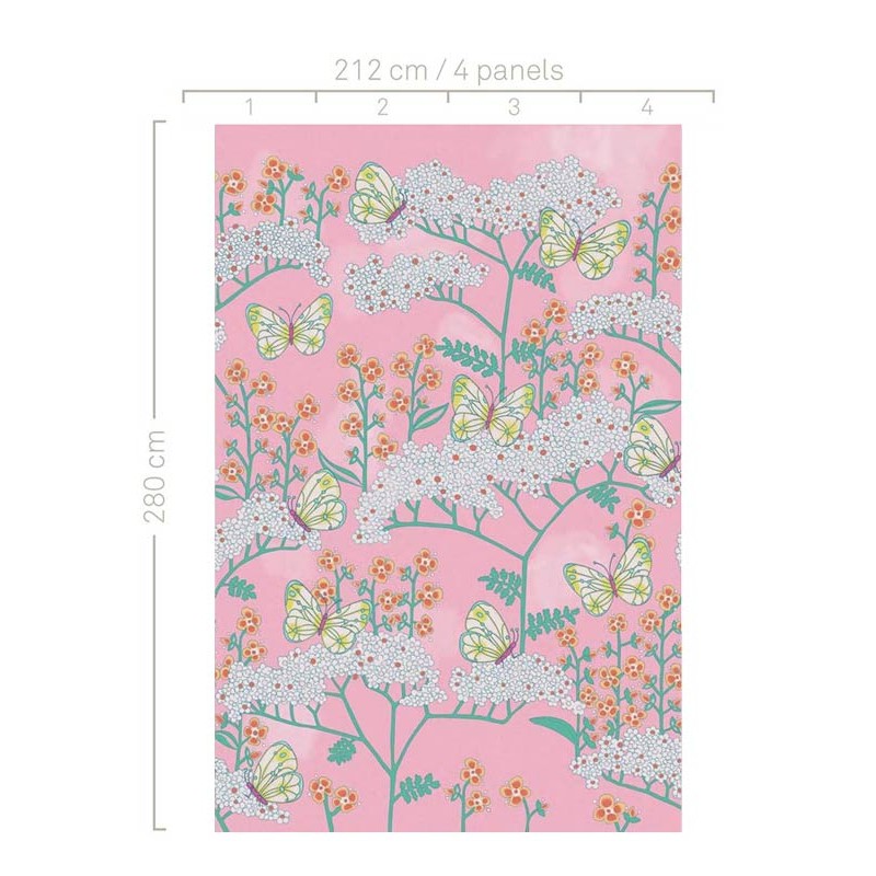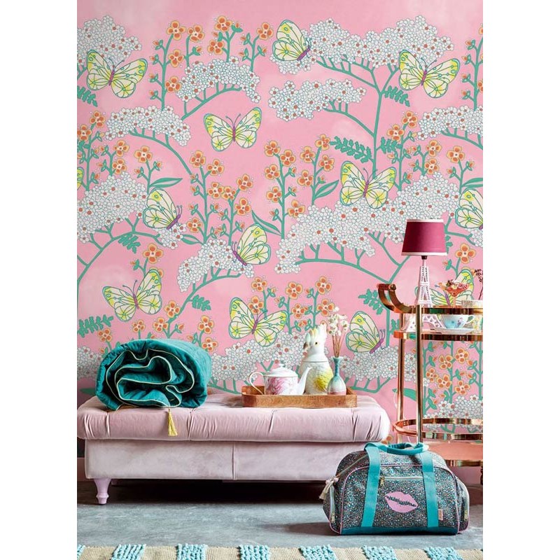 Mural de pared infantil rosa con mariposas y flores de Eijffinger, colección Rice 2. Medidas: 212 x 280 cm