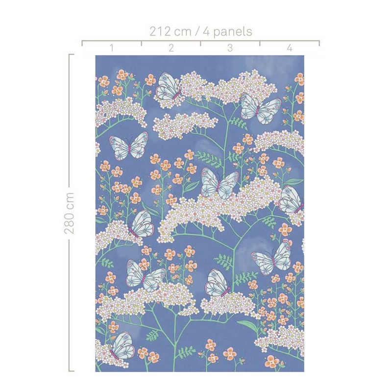 Mural de pared infantil mariposas revoloteando en las flores de Eijffinger, colección Rice 2. Medidas: 212 x 280 cm