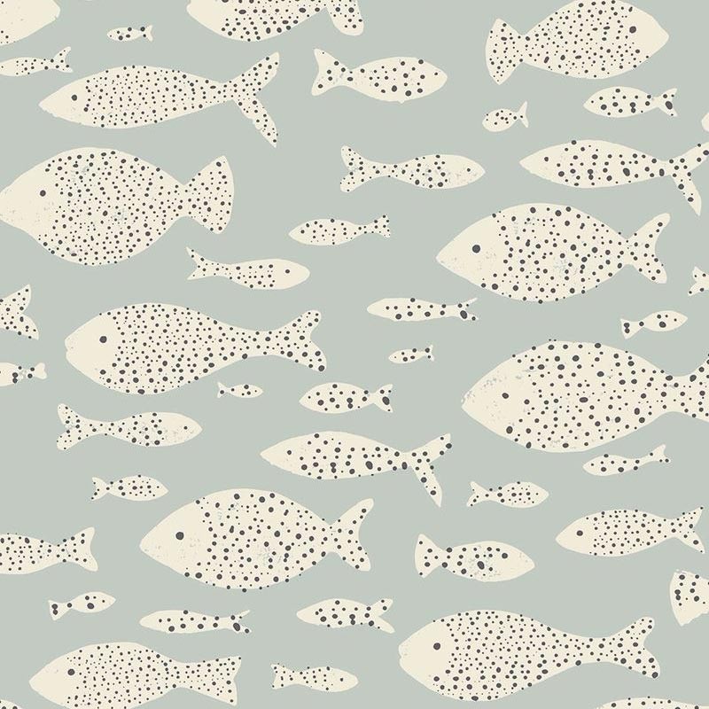 Papel pintado infantil peces verde pastel de Eijffinger, colección Explore. Medidas: 52 cm x 10 m. Papel de pared tejido no tejido y lavable.