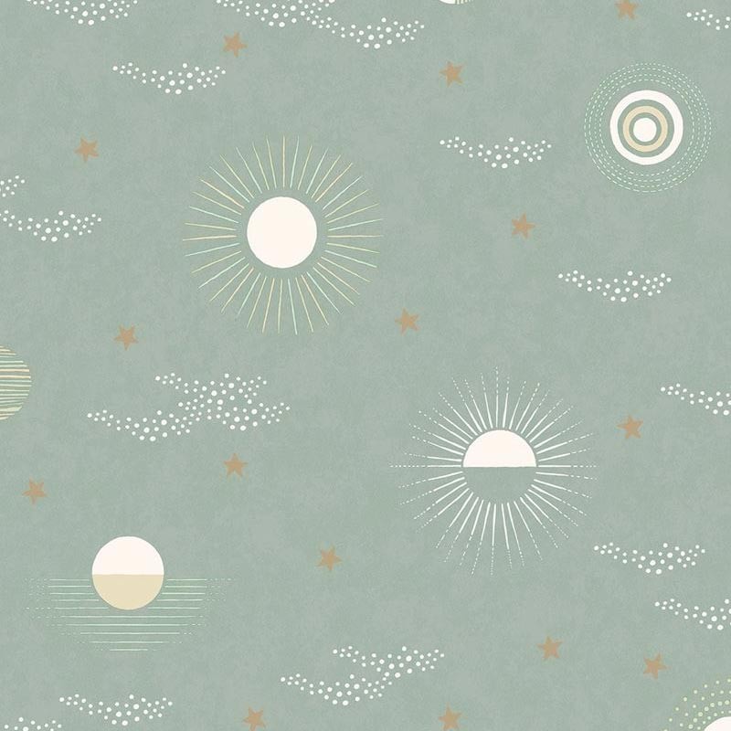 Papel pintado infantil astros del cielo beige metalizado de Eijffinger, colección Explore. Medidas: 52 cm x 10 m. Papel de pared tejido no tejido y lavable.
