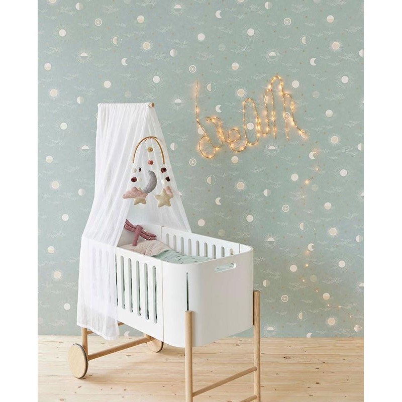 Papel pintado infantil luna y estrellas metalizado de Eijffinger, colección Explore. Medidas: 52 cm x 10 m. Papel de pared tejido no tejido y lavable.