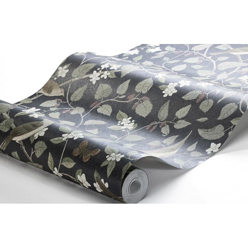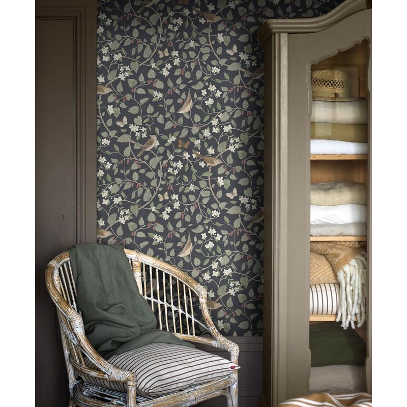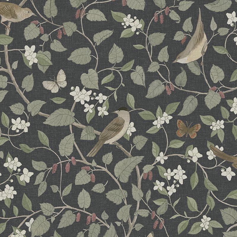 Lleve a su hogar la belleza de un día temprano de primavera y cuélguelo en su sala de estar, oficina o escalera para lograr un estilo escandinavo tranquilo. Papel pintado fondo negro tenue que contrasta maravillosamente con los tonos verde suave, beige marrón neutro y rojo mora del patrón de flora y fauna, pájaros cantores y mariposas entre ramas de morera y dulces flores de azahar