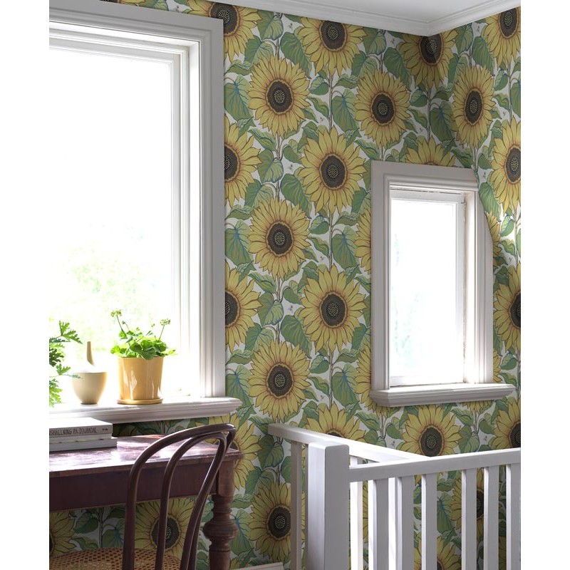 Papel pintado blanco nítido y un patrón floral divertido en tonos amarillo, naranja, verde y azul brillante, con un patrón pintado a mano con gouache de llamativos girasoles con sus deliciosas hojas, llena tu hogar de calidez y alegría. Cuelga este hermoso papel pintado en tu sala de estar, comedor u oficina para lograr un estilo inspirador que rezuma positividad y encanto escandinavo.