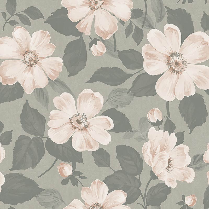 Fleurs de couleur rose pâle avec feuillage vert clair sur un fond vert sauge doux, papier peint relaxant et magnifique. Le motif de fleurs entrelacées avec des feuilles luxuriantes rappelle les arômes doux et délicats d'un après-midi ensoleillé de printemps. Accrochez-le dans votre chambre à coucher, couloir ou salle à manger.