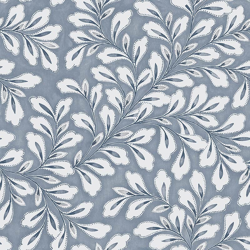 Papel pintado relajante de azules apagados, diseño escandinavo. Un patrón caprichoso de hojas simples pero elegantes se ilumina en la pared a través de un ingenioso juego de colores para darle profundidad e interés al papel. Indicado para dormitorio, cocina o sala de estar para una estética clásica con un toque contemporáneo.