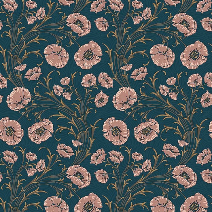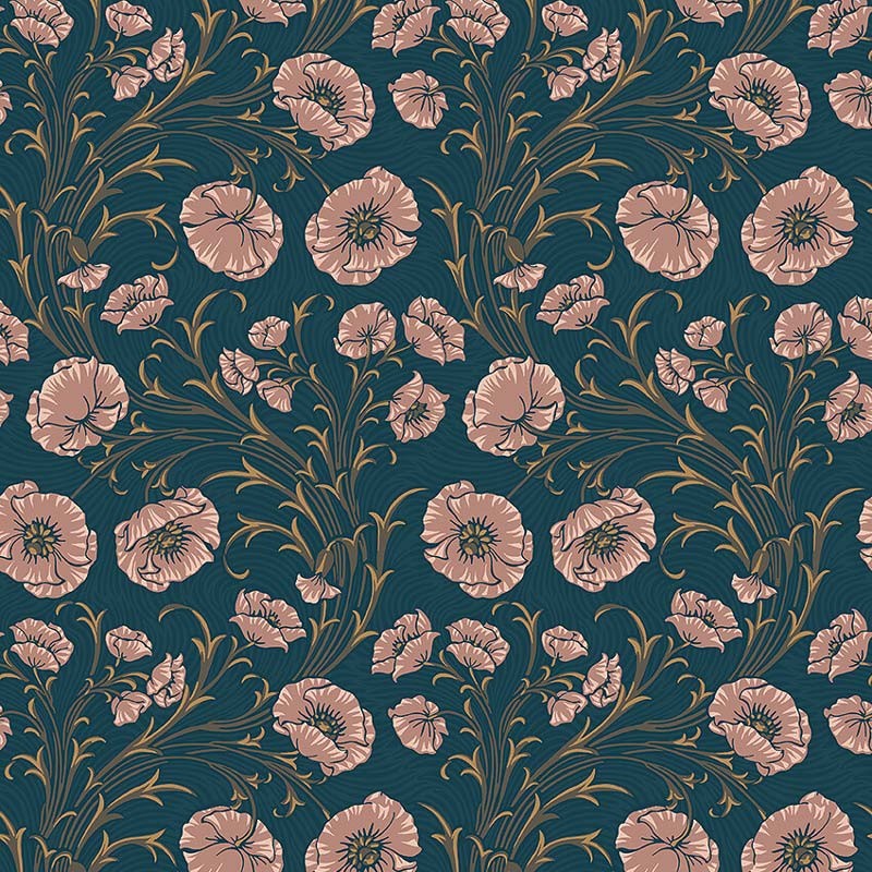 Papel pintado rosa apagado y azul oscuro, Poppy Flow rebosa romance y estilo. Con una ilustración clásica Art Nouveau de amapolas en tonos brillantes que serpentean sobre un fondo dramático, está lleno de interés y profundidad. Indicado para salón, dormitorio o rincón de lectura para un oasis bohemio y lúdico.