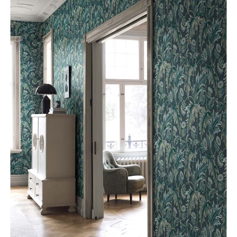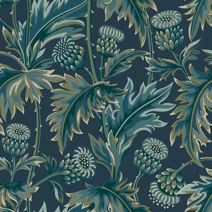 Papel pintado con ricos y vibrantes tonos de azul, verde y lino, sobre un fondo azul oscuro, Treasured Thistle es una prueba de que el amor a primera vista realmente sucede. Inspirándose en un tapiz de principios del siglo XVI que ahora se exhibe en la Colección Burrell en Glasgow, el patrón de cardo denso está pintado a mano y reproducido utilizando técnicas de impresión collagraph.