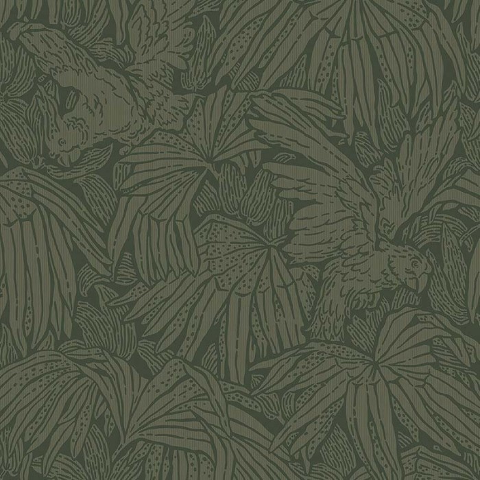 Papel pintado en ricos tonos verde oscuro, patrón encantador y divertido hojas tropicales con loros escondidos que se recrea para las paredes en una paleta tono sobre tono para un acabado sofisticado. Indicado para dormitorio, sala de estar o pasillo para un oasis clásico pero elegante lleno de diversión y carácter.